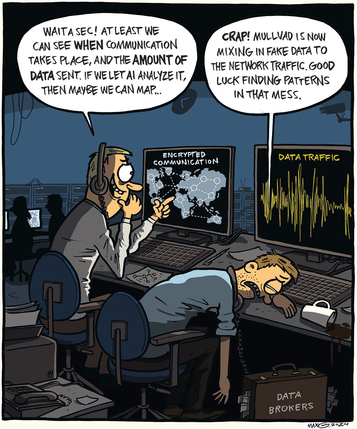 Even if you have encrypted your traffic with a VPN, advanced traffic analysis is a growing threat against your privacy. Therefore, we have developed DAITA – a feature available in our VPN app.