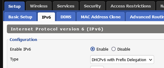 - Click on the Type drop-down menu and select DHCPv6 with Prefix Delegation.