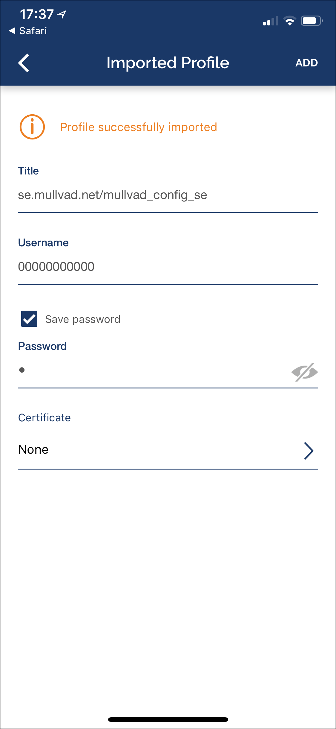 Tap on CONNECT. Note: If it takes too long to enter the username and password then you may get an error: "Failed to Import Profile" when you tap on ADD. In that case try to do it faster by copying the account number in advance and paste it in.