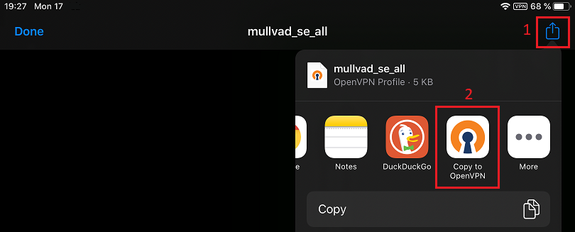 If the OpenVPN app opens then continue to step 10, otherwise do the next two steps too. - Tap on the share button in the top right corner (iPad) or bottom left (iPhone). (1)