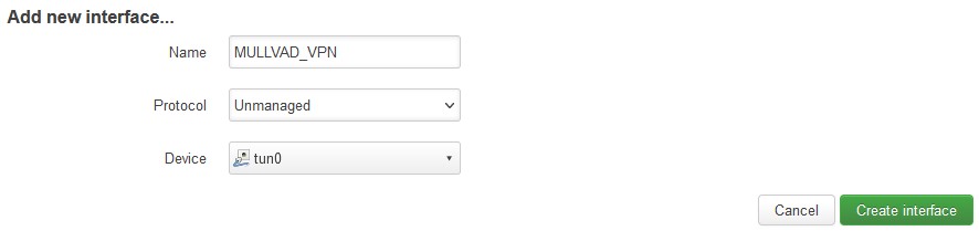 Name of new interface: enter “MULLVAD_VPN” (this must be entered exactly as shown)