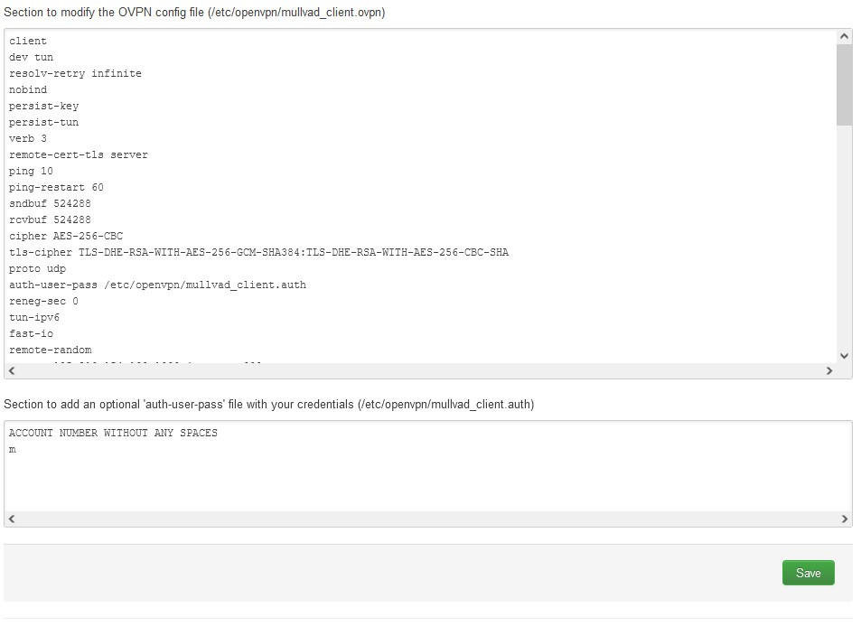 - Under OVPN configuration file upload, set the instance name to "mullvad_client". (Make sure this is correct).