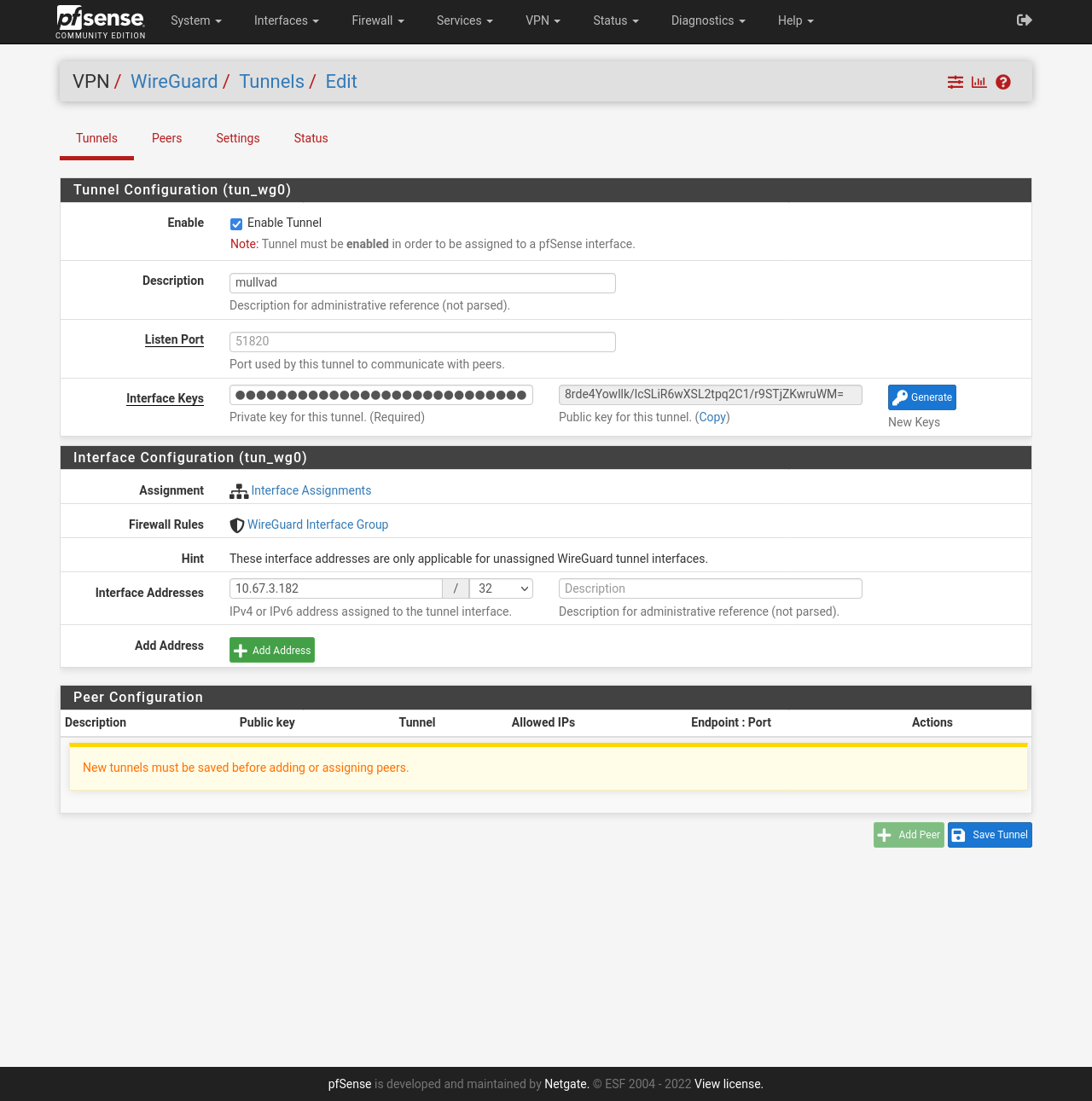 cat /usr/local/etc/wireguard/privkey). - Interface Addresses: Enter the IP you got when running the curl command earlier.