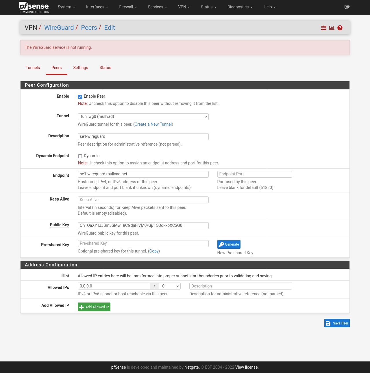 Now we will add the WireGuard server (known as a "Peer" in the web GUI). You can find the IP-addresses and Public Keys for the servers in our Servers list.