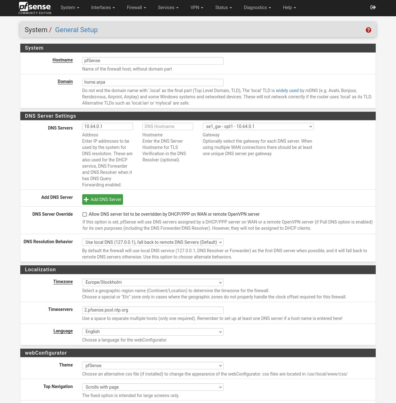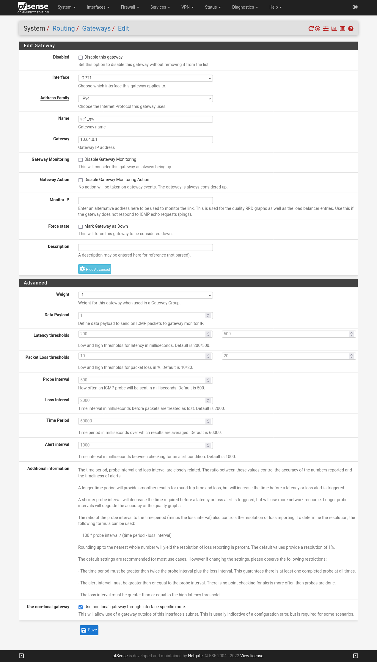 - Change IPv4 Upstream gateway to our newly created "se1_gw - 10.64.0.1".