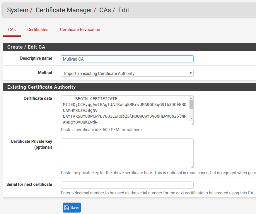 - Paste the certificates found in mullvad_ca.crt that was extracted earlier into the "Certificate data" field.