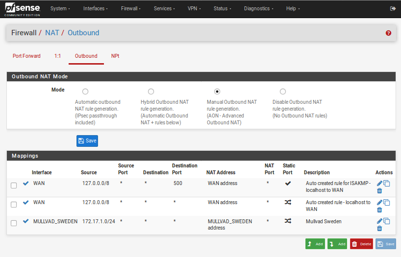- Click on Firewall -> NAT -> Outbound and then select Mode: "Manual Outbound NAT rule Generation (AON) and then click on Save.